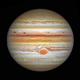 Jupiter, c’est 317 fois la masse de la Terre et onze fois son diamètre. Pricipalement composée de gaz (hydrogène, hélium, méthane, ammoniac…), elle tourne sur elle-même en moins de dix heures, ce qui explique son applatissement aux pôles. Il lui faut onze années pour parcourir une révolution complète autour du Soleil.