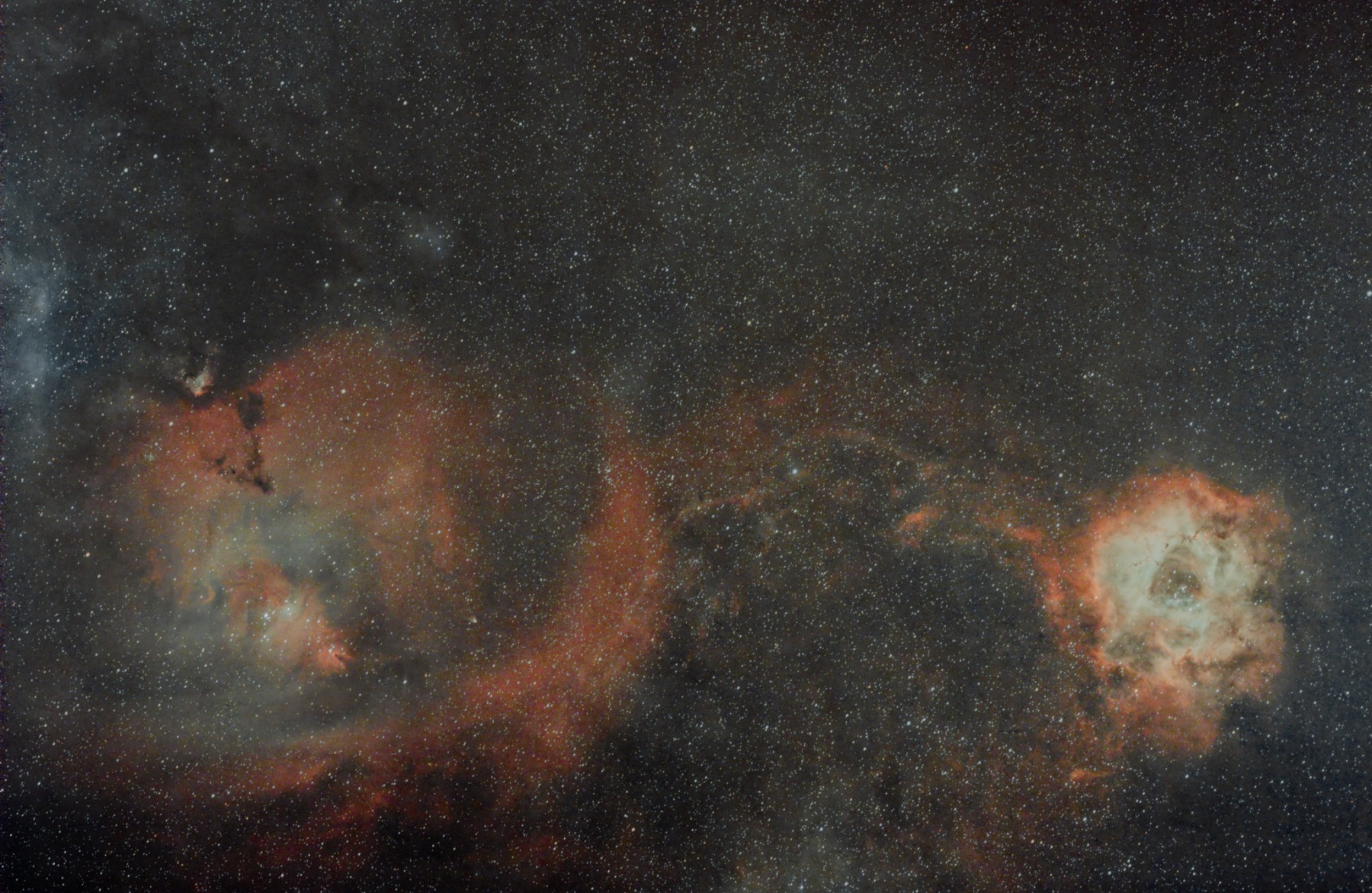 D’accord, Gilles n’a pas orienté par hasard l’astrographe vers le ciel et l’image montre les complexes nébulaires NGC 2237 et NGC 2244.