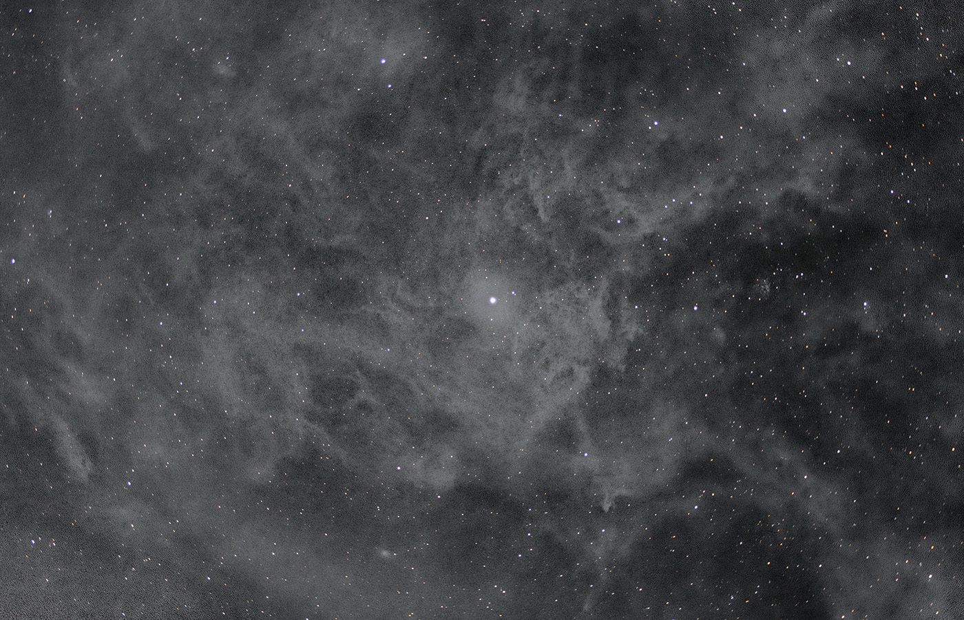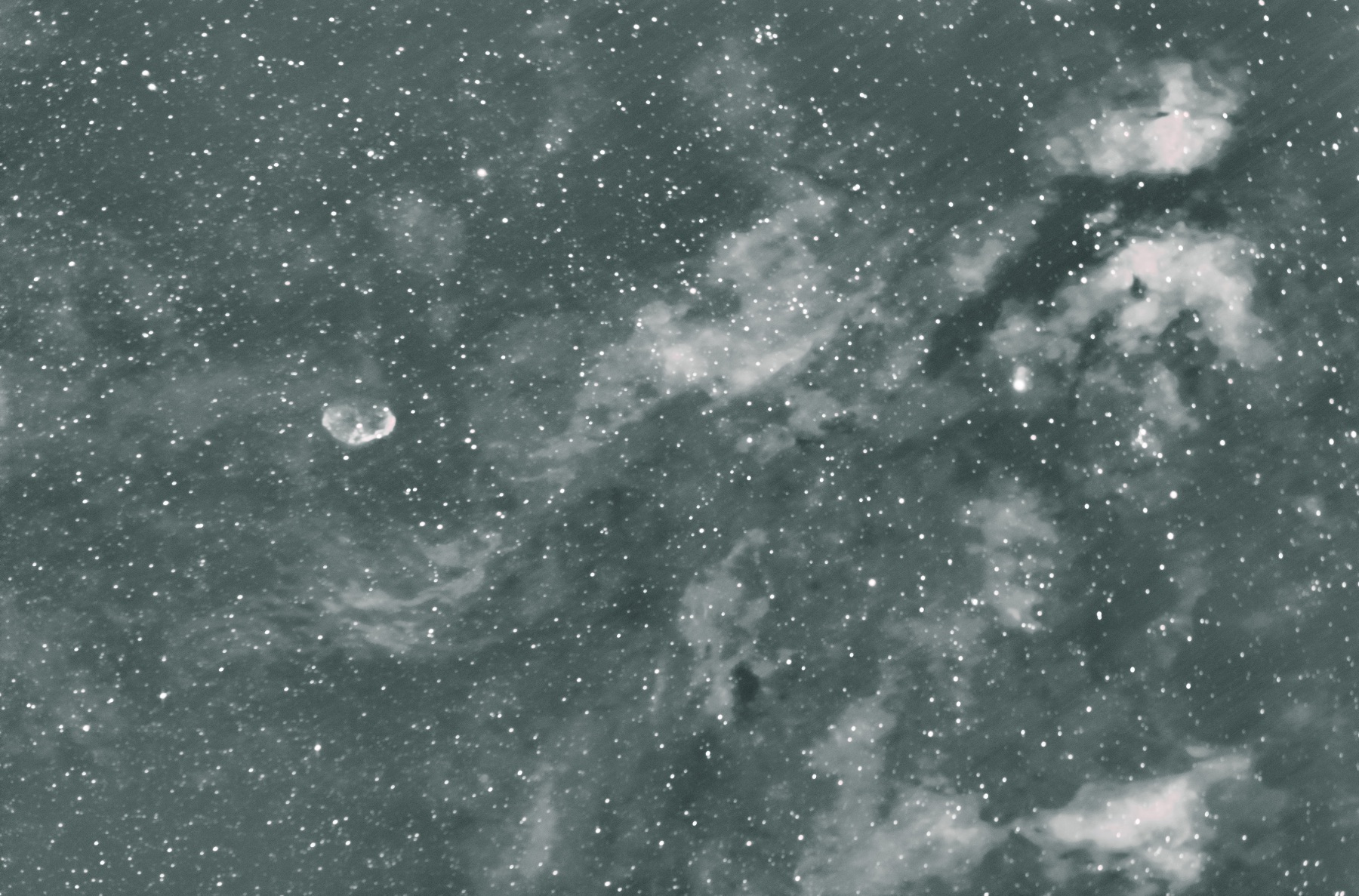 Gilles a quant à lui visé Gamma Cygne et les nombreuses nébuleuses qui entourent l’étoile. Pour la photo au foyer de sa lunette, il utilise un boîtier Canon 6D défiltré, à 1600 iso. 210 images ont été compilées pour obtenir le résultat ci-dessous, après une conversion en noir et blanc pour mettre en évidence les nébuleuses, et le « croissant » (centre gauche). Quelques photos de la voie lactée ont également été prises.